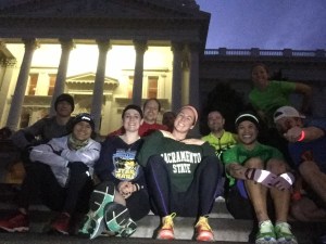 It goes like this … Each set starts with jumping jacks, first set at 55… Then a set of 55 squats. Each round goes down by 5 with the jacks being partnered with either squats, sit ups or push ups. Between each change of numbers we mix in a run from the steps down to the 10th street sidewalk and back.